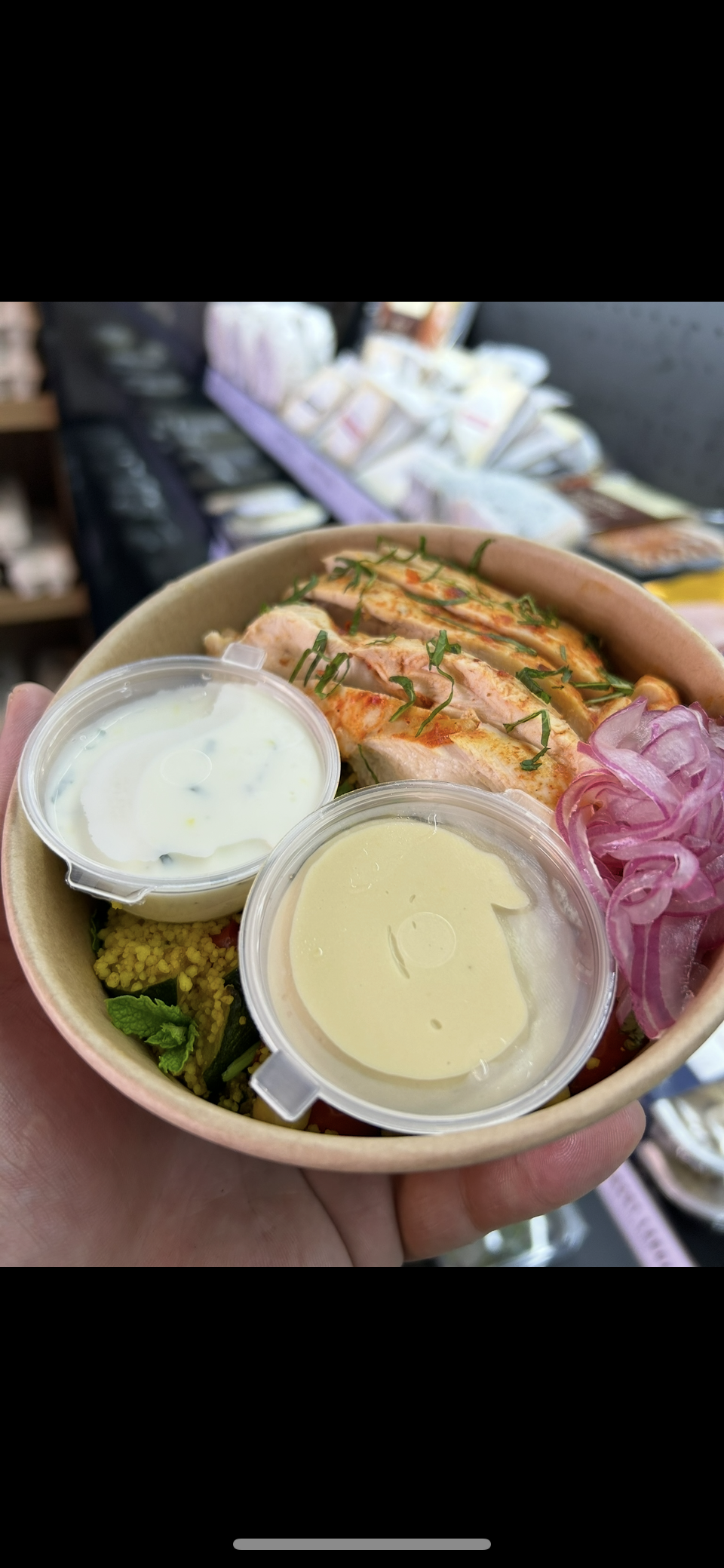 Harissa spiced chicken, Moroccan couscous, pickled onions, roast garlic hummus & mint yogurt